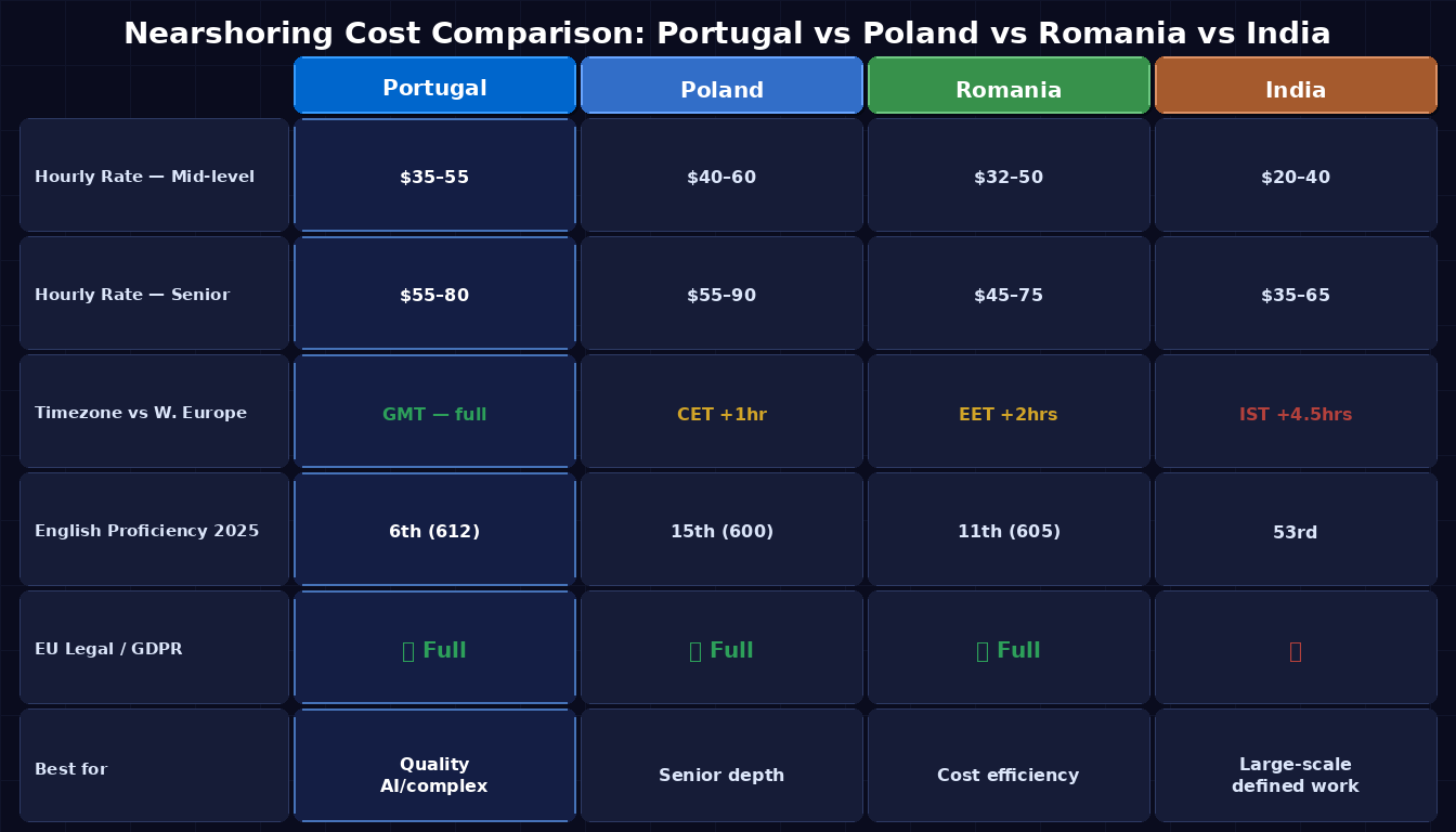 Comparison table — Portugal, Poland, Romania, India across hourly rate, timezone, English proficiency, EU legal framework, retention signal, best for