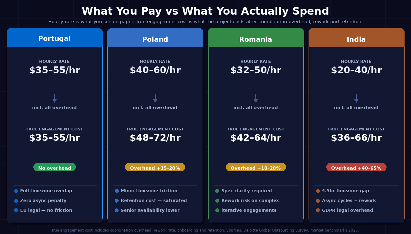 True cost of engagement comparison — direct hourly rate vs total engagement cost including coordination overhead for Portugal, Poland, Romania and India