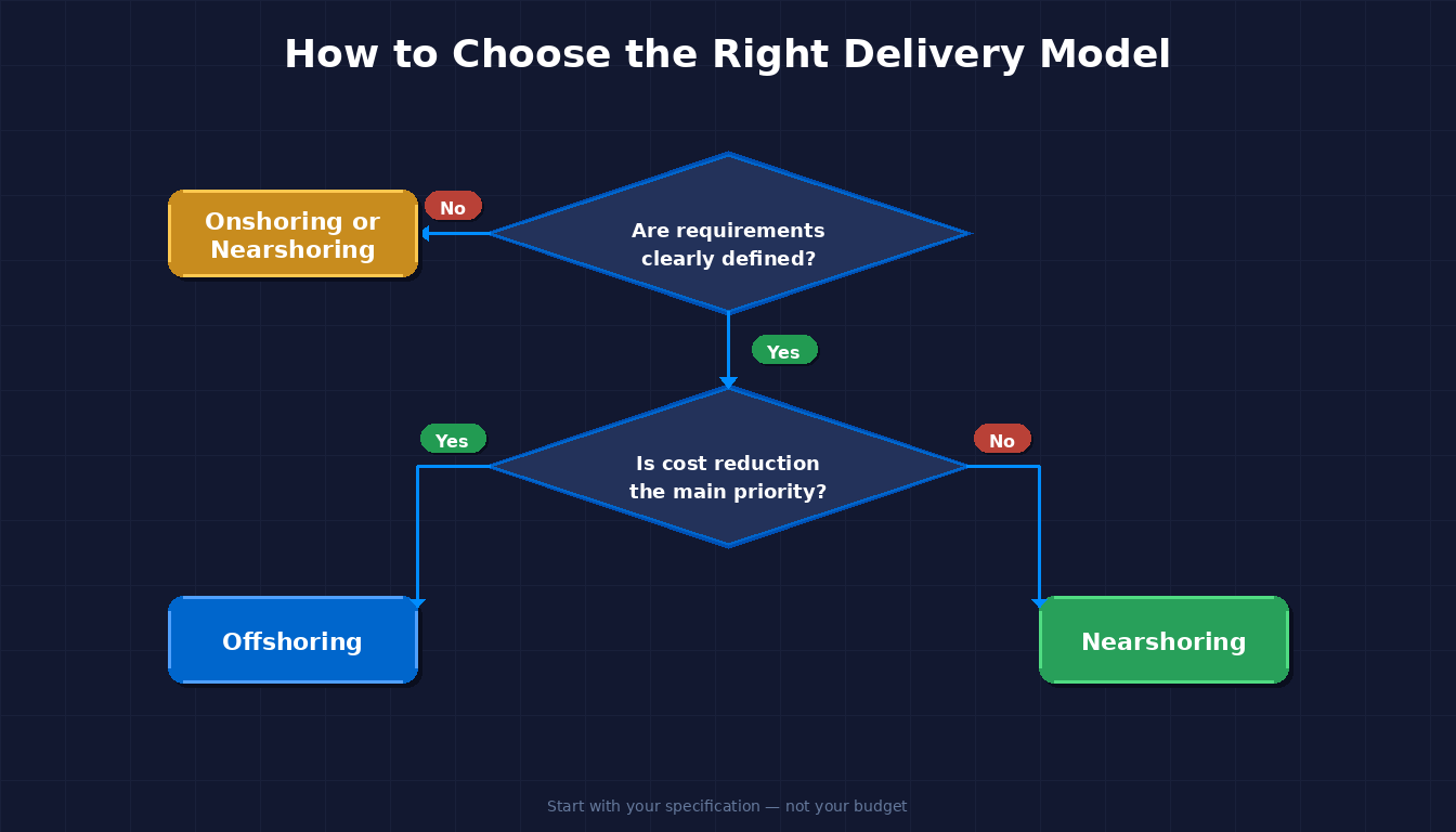 First: What is the state of your specification and requirements? If you have a precise, documented, prioritised backlog and stable architecture, offshore is viable. If you are still discovering what to build, onshore or nearshore decision-making is required.