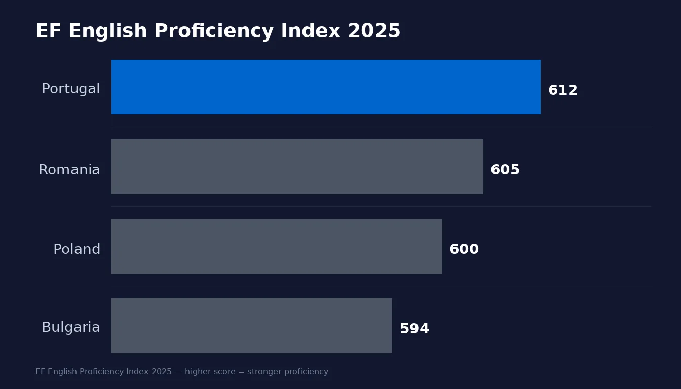 Portugal ranks 6th globally in the 2025 EF English Proficiency Index, with a score of 612 — an all-time high, up from 605 in 2024 — placing it among the top nations for English proficiency worldwide. To contextualise what that means in practice: Romania ranked 11th (605) and Poland 15th (600) in the same index — countries that have been established nearshore destinations for considerably longer. The gap is not trivial. It translates directly into the quality of asynchronous documentation, the accuracy of requirements interpretation, the speed of alignment in distributed standups, and the confidence with which Portuguese engineers engage with client leadership without requiring an intermediary layer.